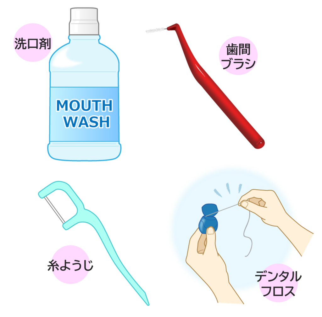 機械的清掃では、基本的に歯ブラシが大切ですが、歯間ブラシ、デンタルフロス(糸楊枝)、さらには化学的には、タンパク分解酵素を含むような洗口剤を併用することも有効です。